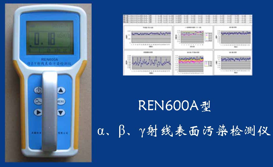 REN600A 表面沾污檢測儀REN600A型α、β、γ射線表面污染檢測儀即可檢測α、β、γ射線,也能檢測到X射線,它采用高速嵌入式微處器作為數(shù)據(jù)處理單元,點(diǎn)陣式大屏幕LCD液晶顯示,讀數(shù)清晰、操作方便,具有400條超大容量數(shù)據(jù)存儲(chǔ)。儀器采用進(jìn)口的大面積MICA蓋革探測器,具有較高探測效率,可進(jìn)行α、β輻射表面污染檢測和X、γ輻射劑量率的監(jiān)測。此外通過配套的RenriCont表面污染管理軟件可將存儲(chǔ)的數(shù)據(jù)讀出后分析。可廣泛用在制藥廠、實(shí)驗(yàn)室、發(fā)電廠、進(jìn)出口商檢、采石場、環(huán)境實(shí)驗(yàn)室、環(huán)境污染調(diào)查、核安全應(yīng)急、緊急狀況營救站、金屬處理廠、地下油田、供油管道裝備、醫(yī)院核醫(yī)學(xué)科、同位素實(shí)驗(yàn)室、環(huán)境保護(hù)和警察局等部門。REN600A型α、β、γ射線表面